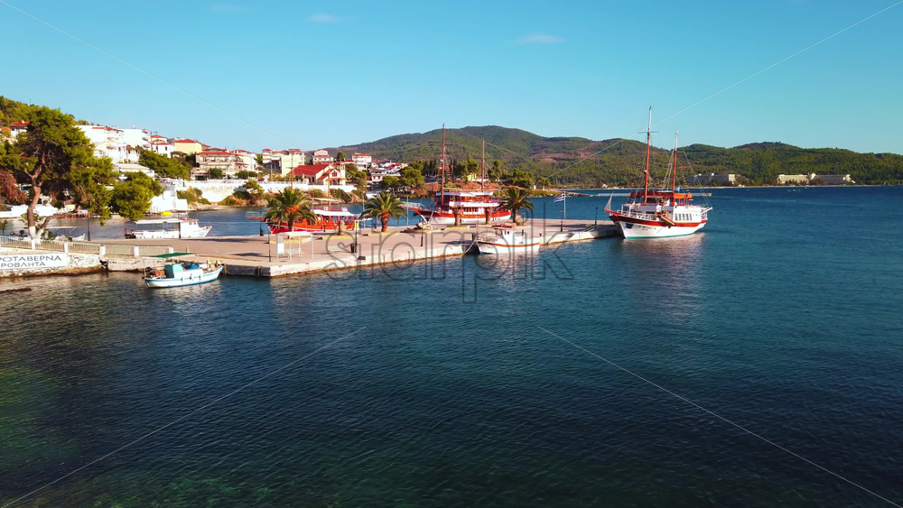 NEOS MARMARAS, GREECE – OCTOBER 8, 2020: Wide pier with few palms on it, three moored sailboats, green hill and town on the background. Slow motion Royalty Free Stock Video Footage