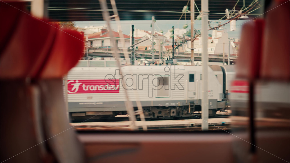 Video Nice, France – November 4, 2024: Close up of the seats near the window of a moving train with a view of the train station Royalty Free Stock Video Footage