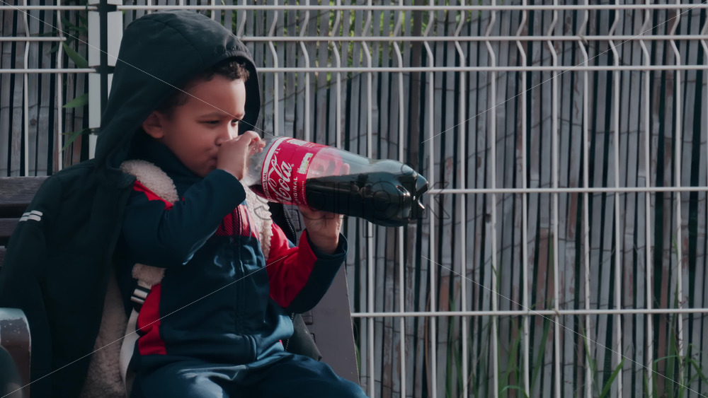 Video Nice, France – October 24, 2024: Little child drinking from a big bottle of Coca-Cola on the street Royalty Free Stock Video Footage