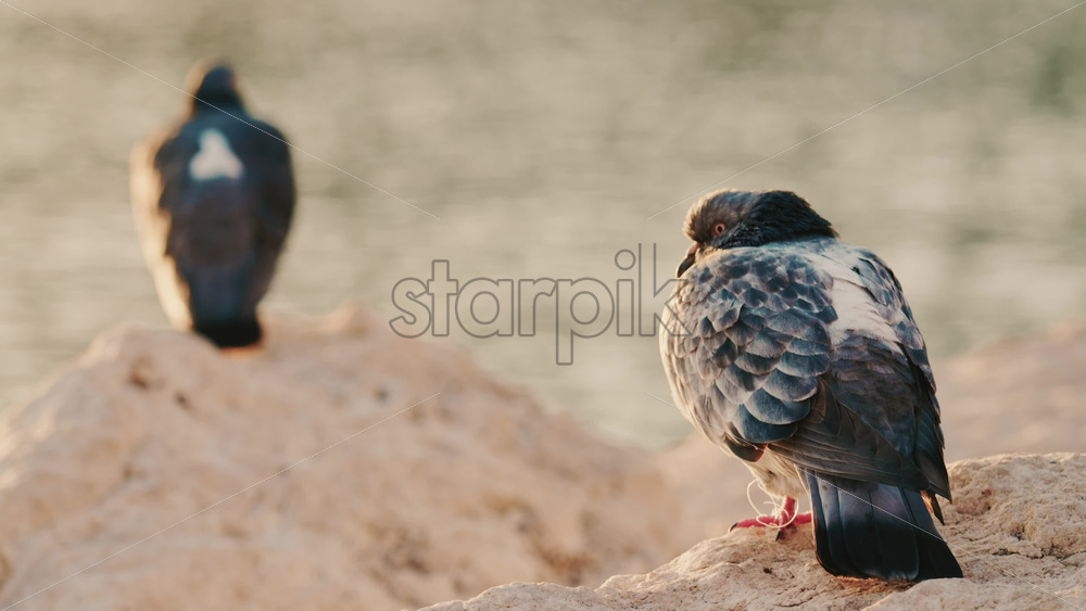 One pigeon in sharp focus with another blurred in the background, both resting on coastal rocks near calm water Royalty Free Stock Video Footage