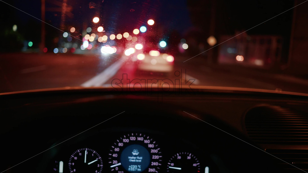 Night driving scene from inside a car with steering wheel and dashboard visible