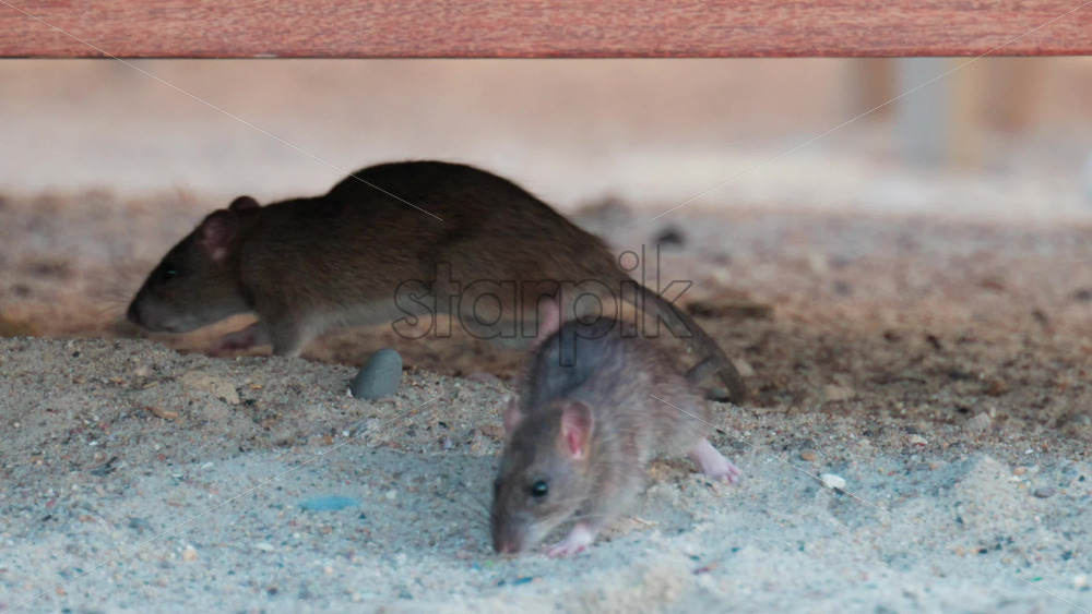 Brown rat walking under a wooden structure in a sandy environment Royalty Free Stock Video Footage