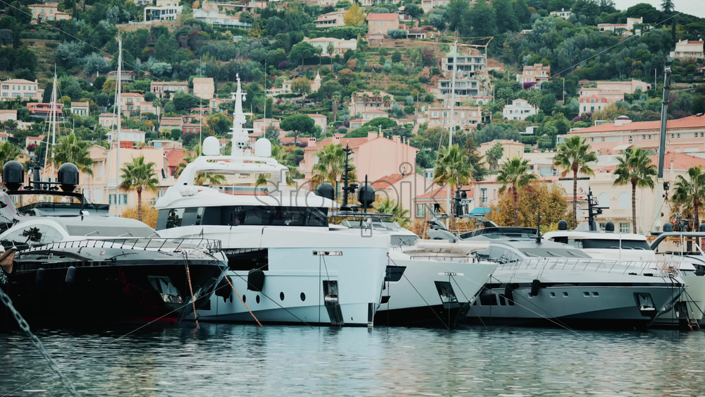 Panoramic view of superyachts lined up in a marina, framed by palm trees and pastel houses on the hillside Royalty Free Stock Video Footage