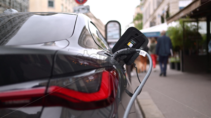 Home » Shop » 1 Video » Video Paris, France – June 18, 2024: Back view of a black BMW i4 car charging on the street