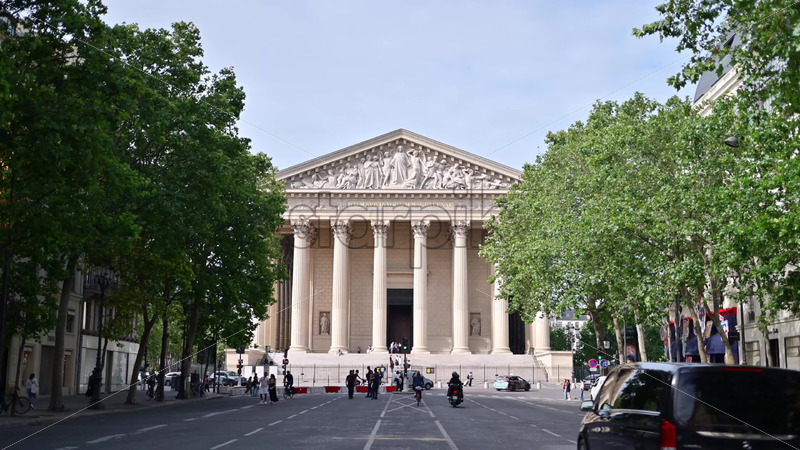 VIDEO Paris, France – June 18, 2024: Street view of the Church of Sainte-Marie-Madeleine on Place de la Madeleine Royalty Free Stock Video Footage