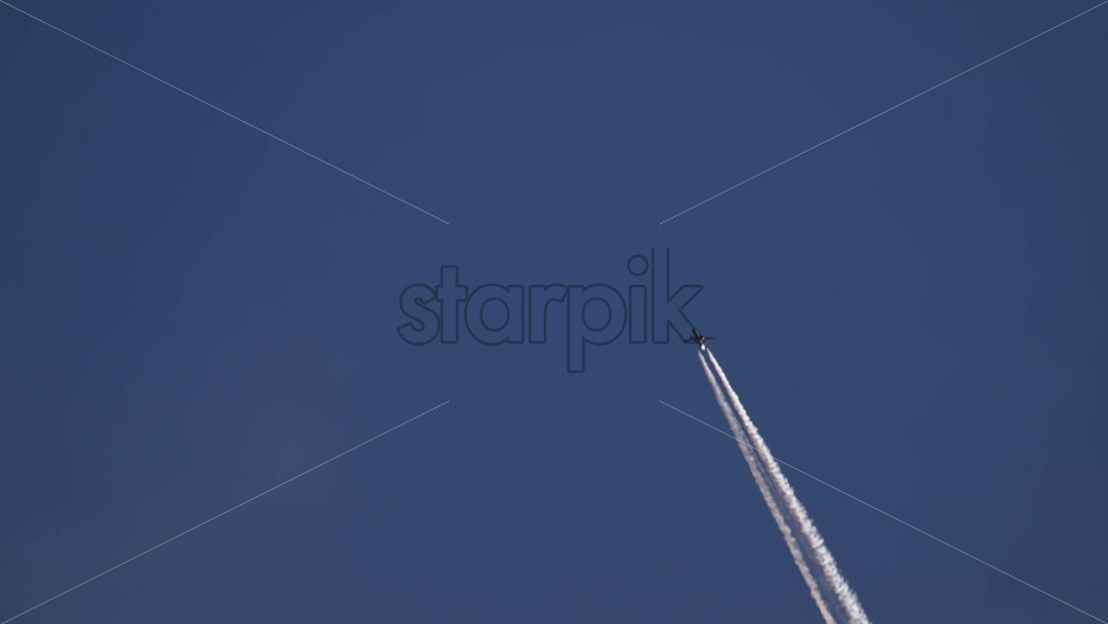 Airplane flying high above leaving long contrails in a clear blue sky Royalty Free Stock Video Footage