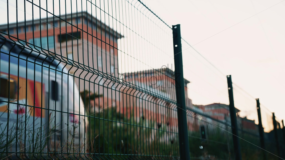 Abstract shot of a high speed train passing behind a metal fence, creating motion blur and geometric line Royalty Free Stock Video Footage