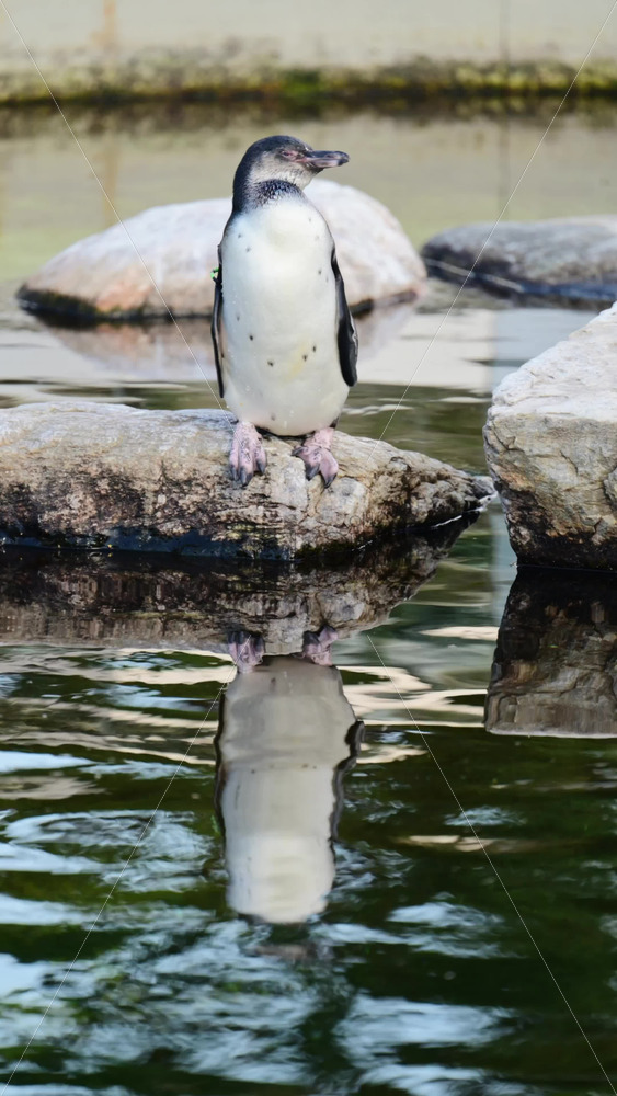 Penguin with black and white plumage standing on a rock with its reflection in water Royalty Free Stock Video Footage