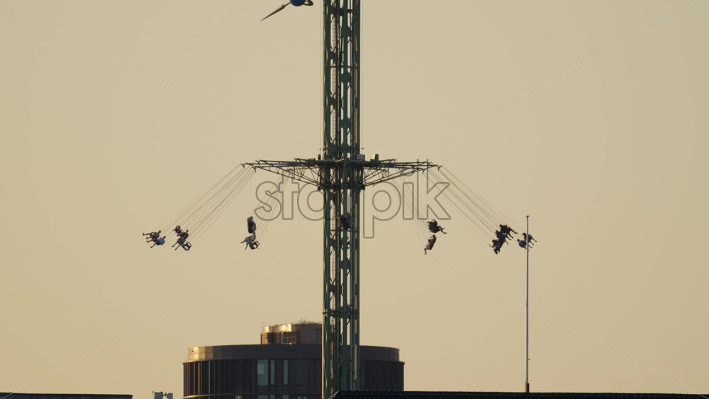 People enjoying a thrilling swing carousel ride high in an amusement park. Copenhagen, Denmark Royalty Free Stock Video Footage