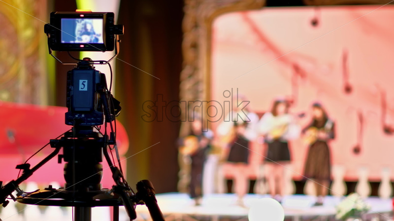 Chisinau, Moldova – March 29, 2024: Professional long camera filming and flashing studio lights on the ceiling of a TV set Royalty Free Stock Video Footage Royalty Free Stock Video Footage