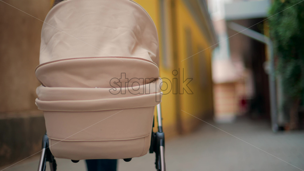 Rear view of a beige baby stroller moving along a narrow alley with yellow and brown walls Royalty Free Stock Video Footage