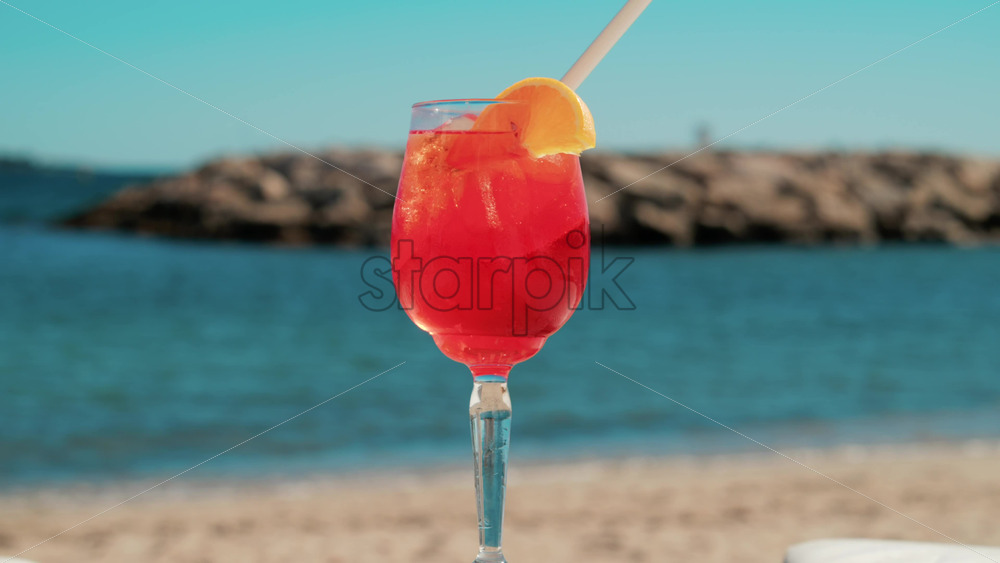 Refreshing red orange cocktail with ice and orange slice against the deep blue Mediterranean Sea Royalty Free Stock Video Footage