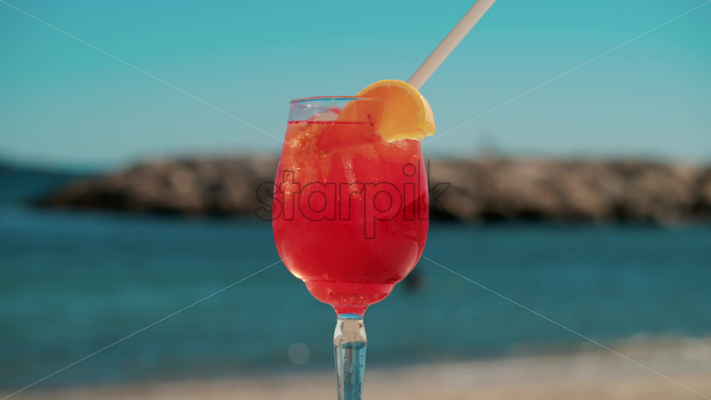Refreshing red orange cocktail with ice and orange slice against the deep blue Mediterranean Sea Royalty Free Stock Video Footage
