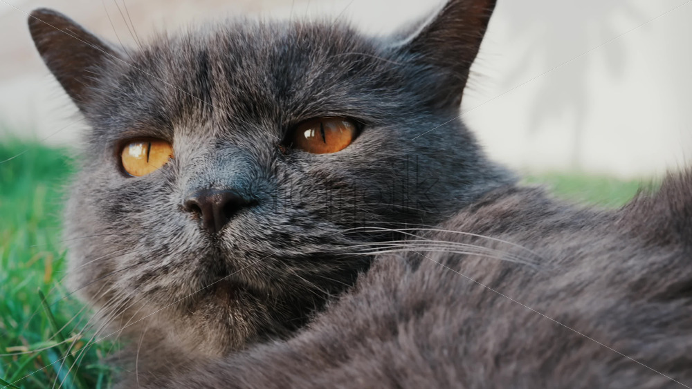 Relaxed grey British Shorthair cat resting on green grass under soft daylight Royalty Free Stock Video Footage