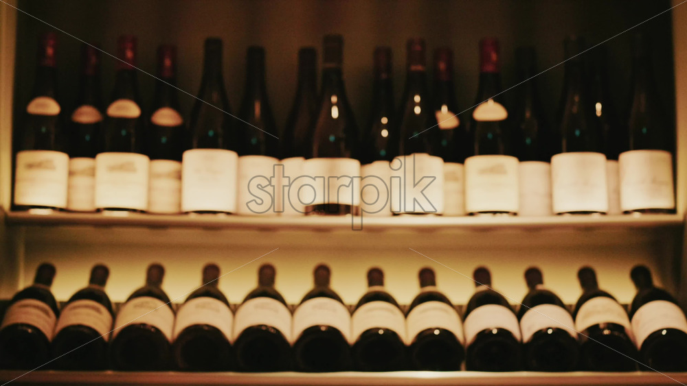Rows of wine bottles neatly arranged on softly lit shelves in a wine cellar or restaurant interior Royalty Free Stock Video Footage