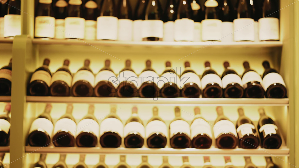 Rows of wine bottles neatly arranged on softly lit shelves in a wine cellar or restaurant interior Royalty Free Stock Video Footage