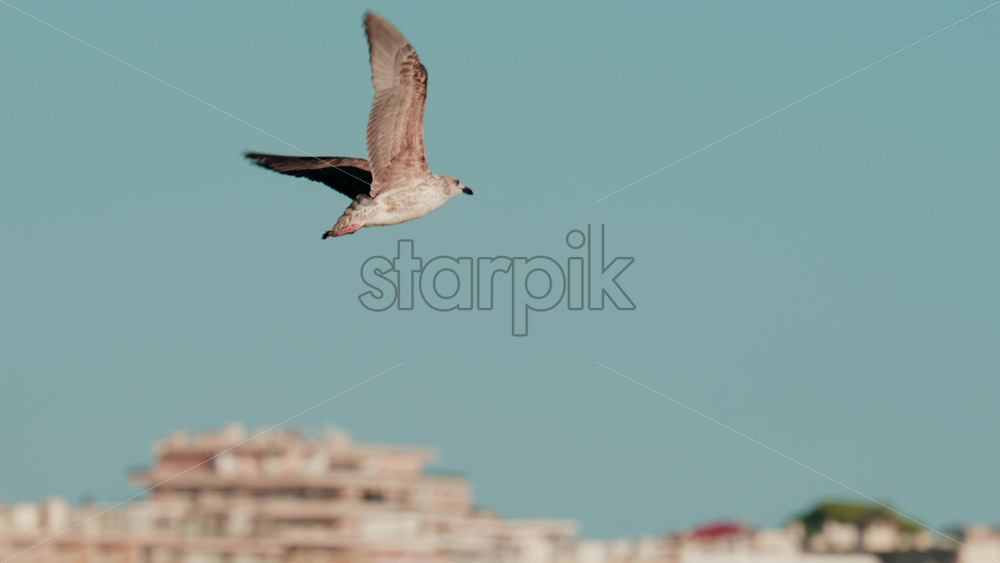 Seagull flying near the coastline with buildings and blue sea in the background Royalty Free Stock Video Footage