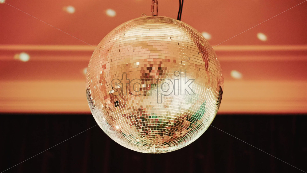 Shiny disco ball reflecting light patterns in a warmly lit interior environment Royalty Free Stock Video Footage