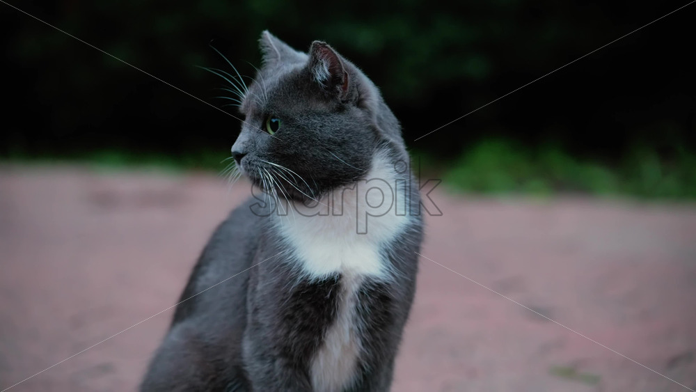 Side profile of a grey and white cat attentively looking into the distance outdoors Royalty Free Stock Video Footage