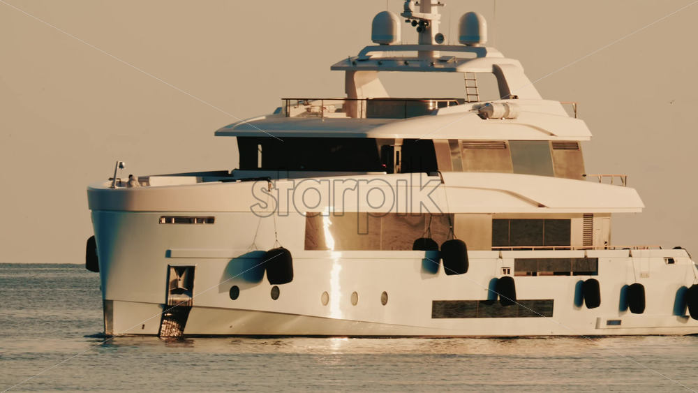 Front view of a luxury motor yacht cruising slowly across calm Mediterranean waters, with a navigation buoy visible nearby Royalty Free Stock Video Footage