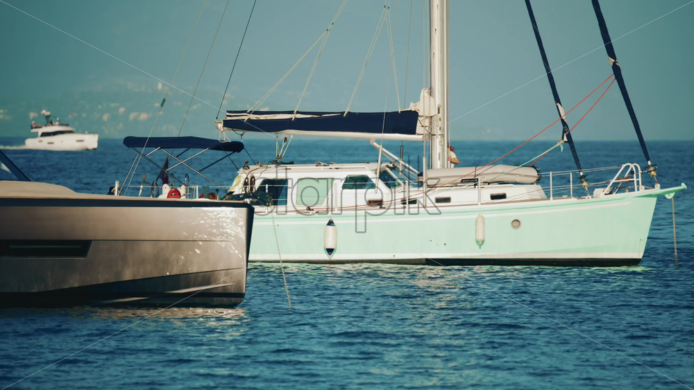 Cannes, France – October 16, 2025: Side view of a sleek metallic yacht reflecting sunlight on calm blue water Royalty Free Stock Video Footage