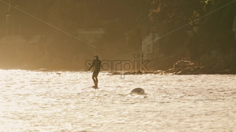 Silhouette of a person riding an electric surfboard on calm sea water during golden hour Royalty Free Stock Video Footage