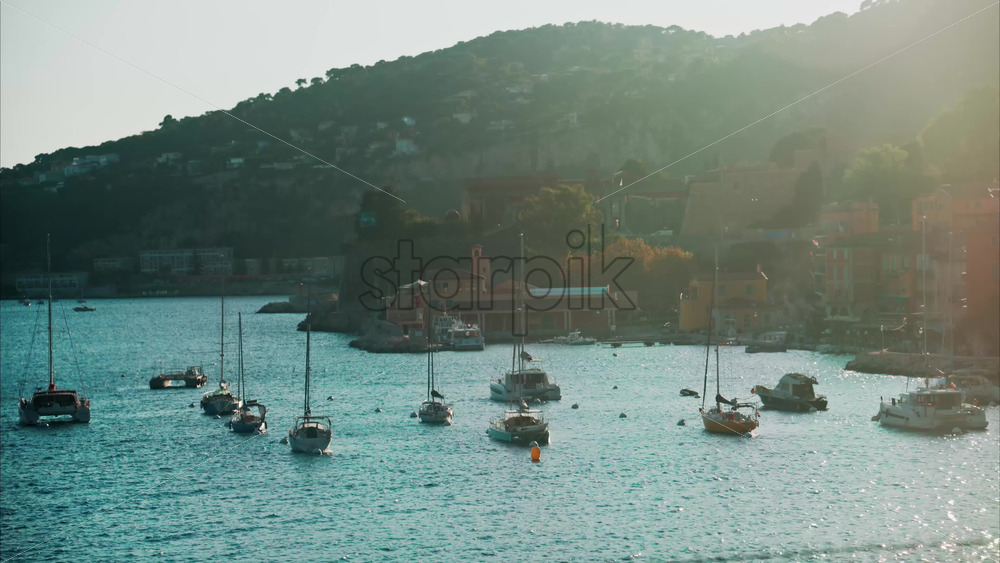 video Small boats docked on the sea in Ligurian Sea in Villefranche-sur-Mer, France seen from a moving train at sunset Royalty Free Stock Video Footage