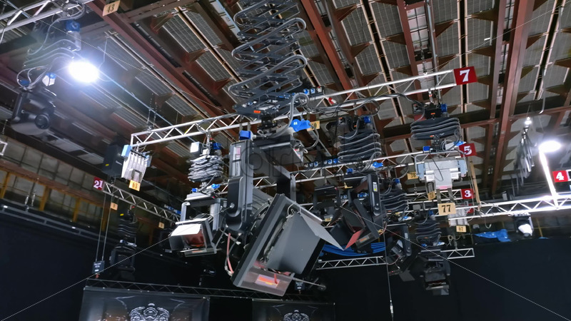 Chisinau, Moldova – March 29, 2024: Professional camera filming and flashing studio lights on the ceiling of a TV set Royalty Free Stock Video Footage Royalty Free Stock Video Footage