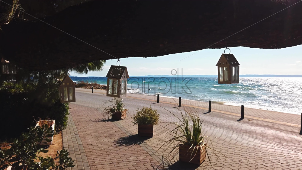 Swaying in the wind cases for candles suspended by a tree branch, Aegean sea on the background in Nikiti, Greece. Slow motion Royalty Free Stock Video Footage