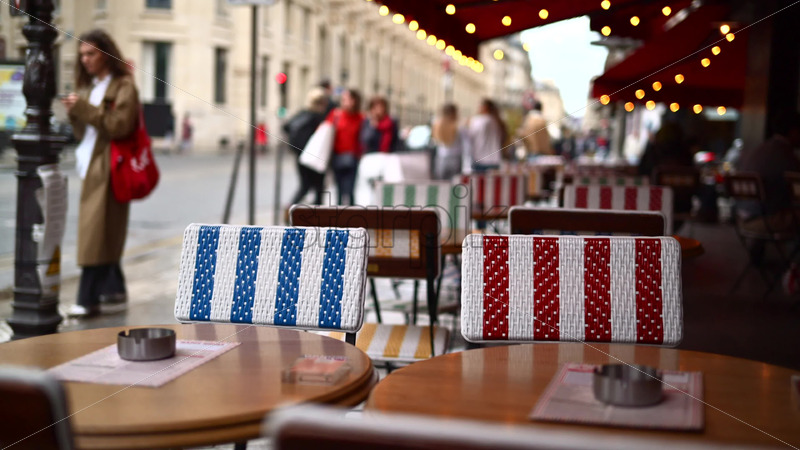 VIDEO Tables at a cafe with blurred people walking in the rain on the background Royalty Free Stock Video Footage