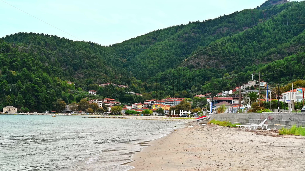 THASOS, GREECE – SEPTEMBER 23, 2020: View of the Aegean sea coast, breakwater near the beach, town under the hill slope full of greenery Royalty Free Stock Video Footage
