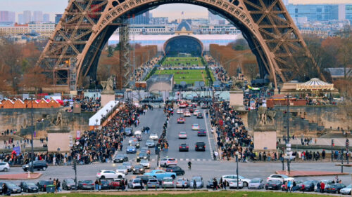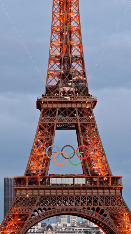 VIDEO The Eiffel Tower with the Olympic Games sign sparkling in the evening in Paris, France. Vertical Royalty Free Stock Video Footage