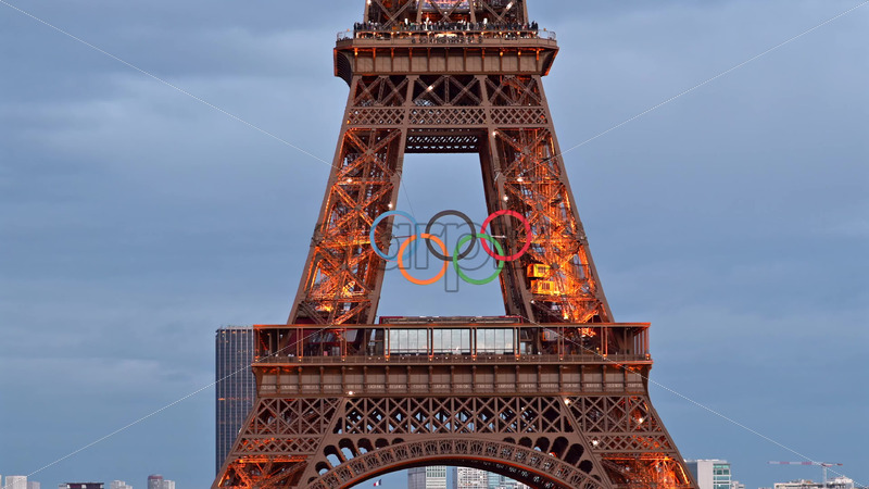 VIDEO The Eiffel Tower with the Olympic Games sign sparkling in the evening in Paris, France Royalty Free Stock Video Footage