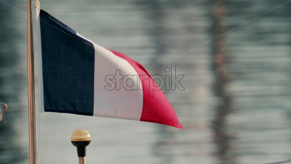 The French flag flutters on a small boat mast with the reflection of the sea in the background Royalty Free Stock Video Footage