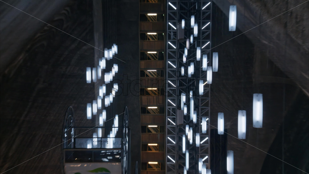 View of the Turda salt mine with wooden railings, walkways, and artificial lighting in Turda, Romania Royalty Free Stock Video Footage