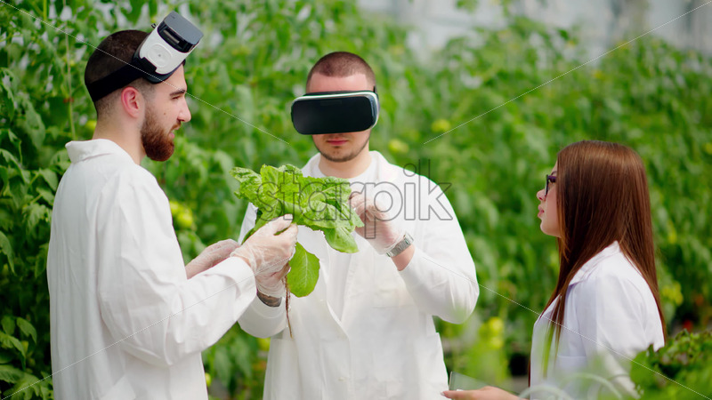 VIDEO Three laboratory technicians in white coats wearing Virtual Reality headsets, analysing lettuce grown with the Hydroponic method in a greenhouse Royalty Free Stock Video Footage