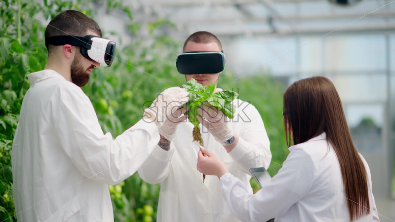 VIDEO Three laboratory technicians in white coats wearing Virtual Reality headsets, analysing lettuce grown with the Hydroponic method in a greenhouse Royalty Free Stock Video Footage