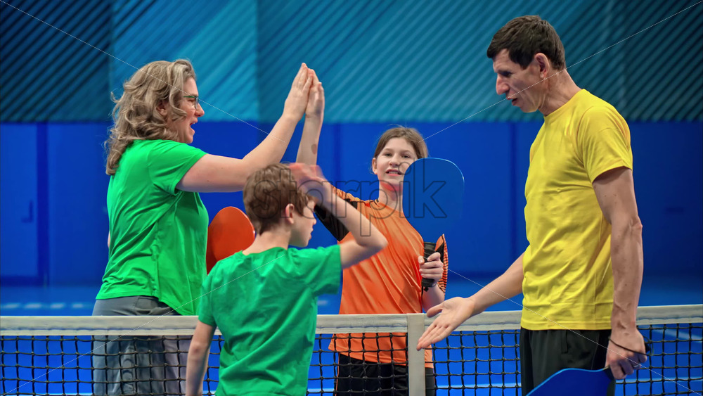 Video Two adults and two children high-fiving after playing pickleball on a blue, inside court Royalty Free Stock Video Footage