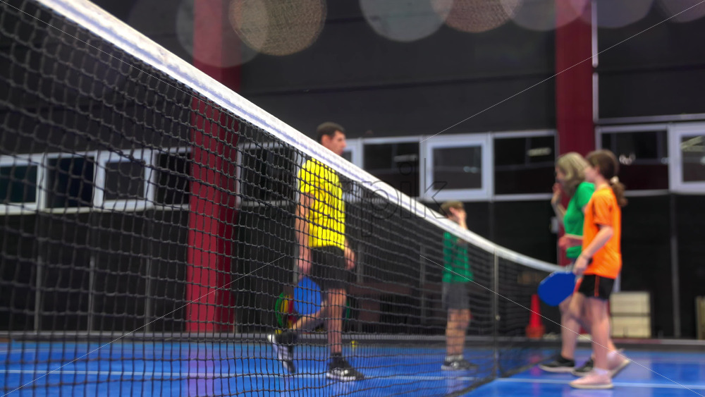 Video A woman and a child playing pickleball on a blue, inside court Royalty Free Stock Video Footage
