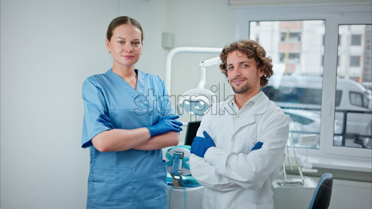 Video Two dentists wearing scrubs and standing and smiling in a dental cabinet, in front of a window Royalty Free Stock Video Footage