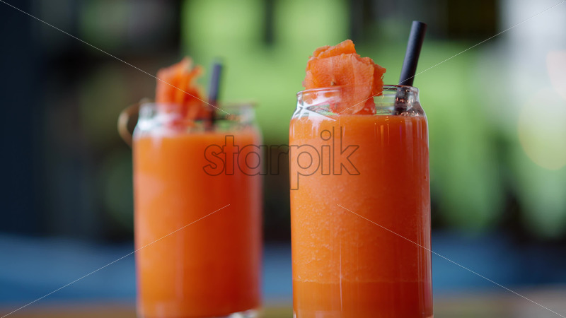 VIDEO Two glasses of carrot juice, on the table at a restaurant Royalty Free Stock Video Footage