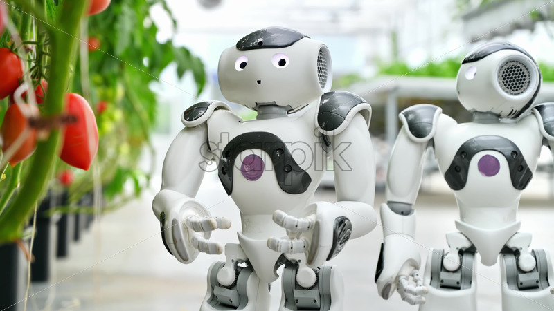 VIDEO Two humanoid robots moving near rows of tomatoes in a greenhouse farm Royalty Free Stock Video Footage