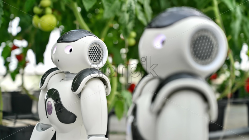 VIDEO Two humanoid robots standing near rows of tomatoes in a greenhouse farm Royalty Free Stock Video Footage