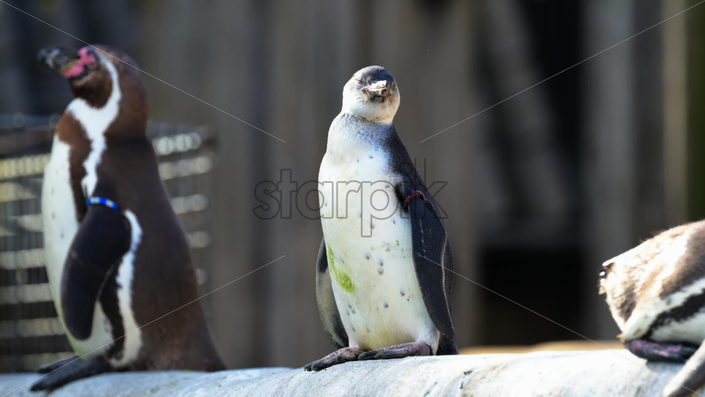 Two Humboldt penguins resting on a rock, observing their surroundings in a zoo enclosure Royalty Free Stock Video Footage