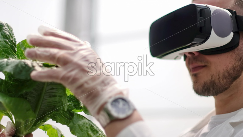 VIDEO Two laboratory technicians in white coats wearing Virtual Reality headsets, analysing lettuce grown with the Hydroponic method in a greenhouse Royalty Free Stock Video Footage