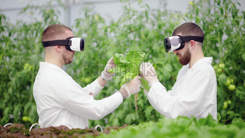 Home » Shop » 1 Video » people » Video Two laboratory technicians in white coats wearing Virtual Reality headsets, analysing lettuce grown with the Hydroponic method in a greenhouse