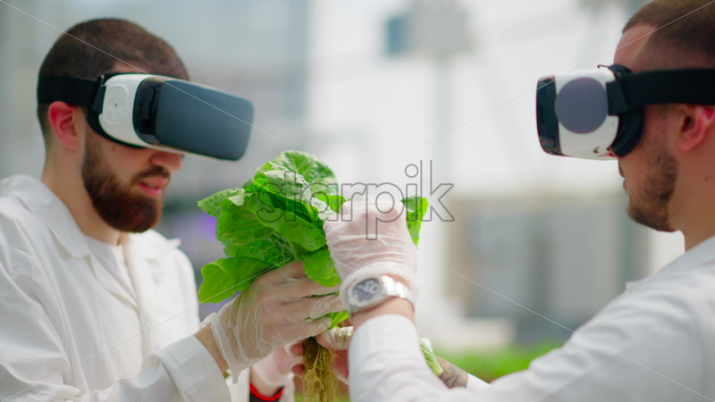 Home » Shop » 1 Video » people » Video Two laboratory technicians in white coats wearing Virtual Reality headsets, analysing lettuce grown with the Hydroponic method in a greenhouse