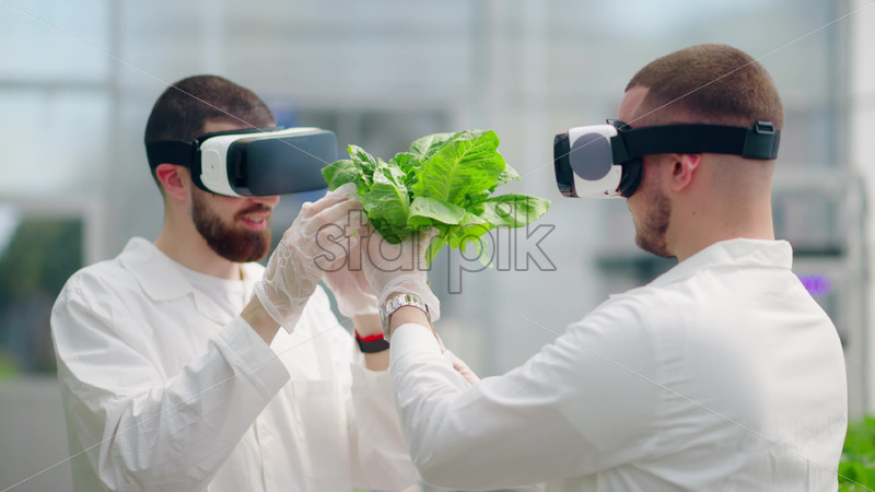 Home » Shop » 1 Video » people » Video Two laboratory technicians in white coats wearing Virtual Reality headsets, analysing lettuce grown with the Hydroponic method in a greenhouse