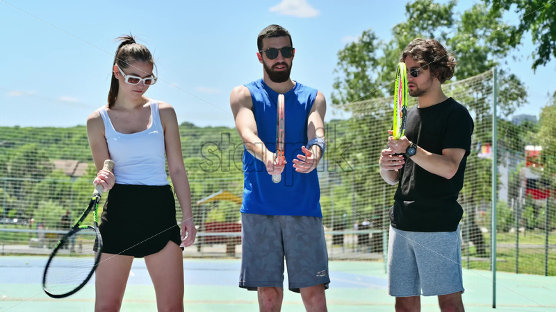 VIDEO Two men and a woman practicing tennis on a blue and green court on a sunny day Royalty Free Stock Video Footage