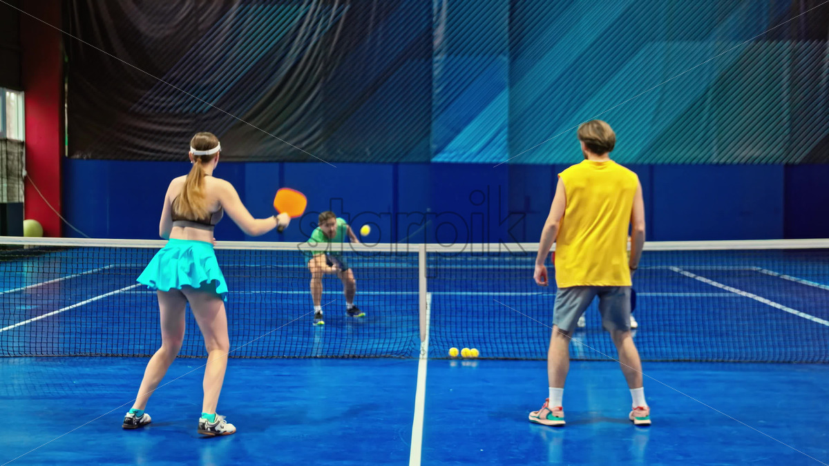 Video A man and a woman training to play pickleball on a blue, inside court Royalty Free Stock Video Footage